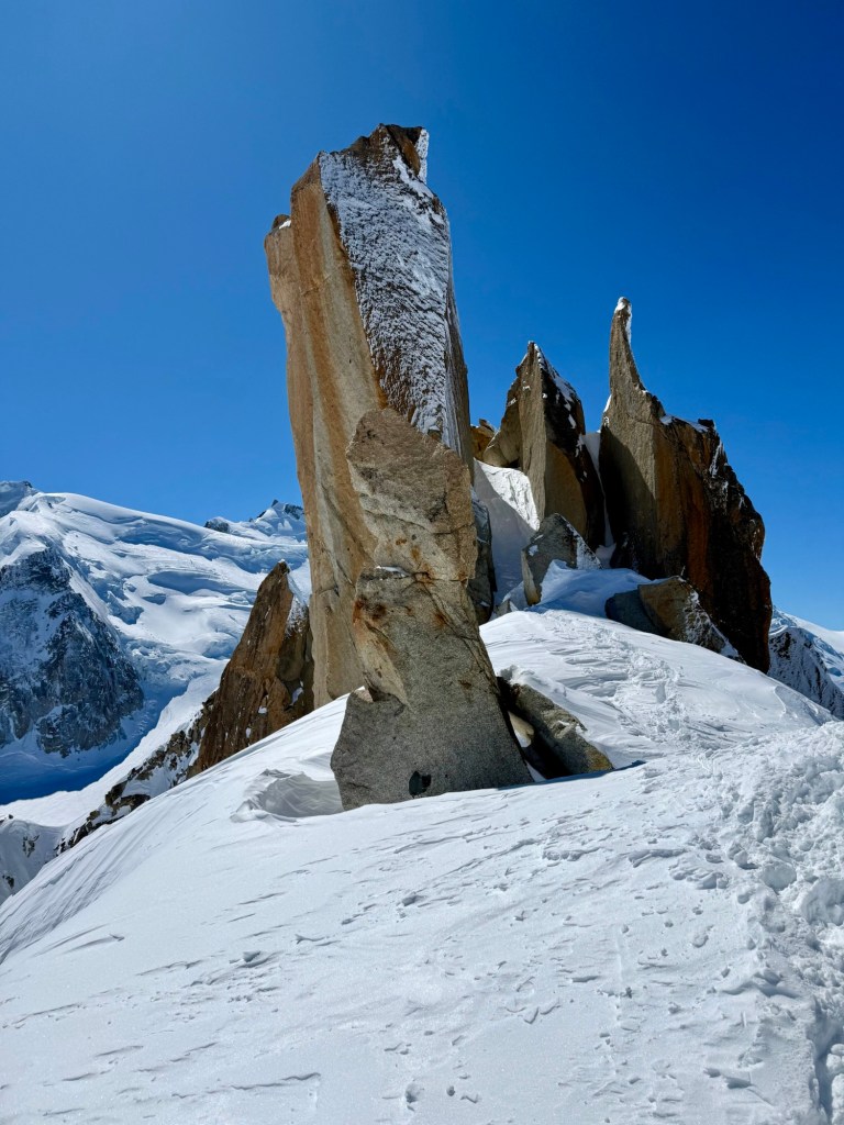 From there, the route flows nicely: snow ridges, short rock steps, and steady progress with ridiculous views across Mont Blanc, Mont Maudit, and the Grandes Jorasses.